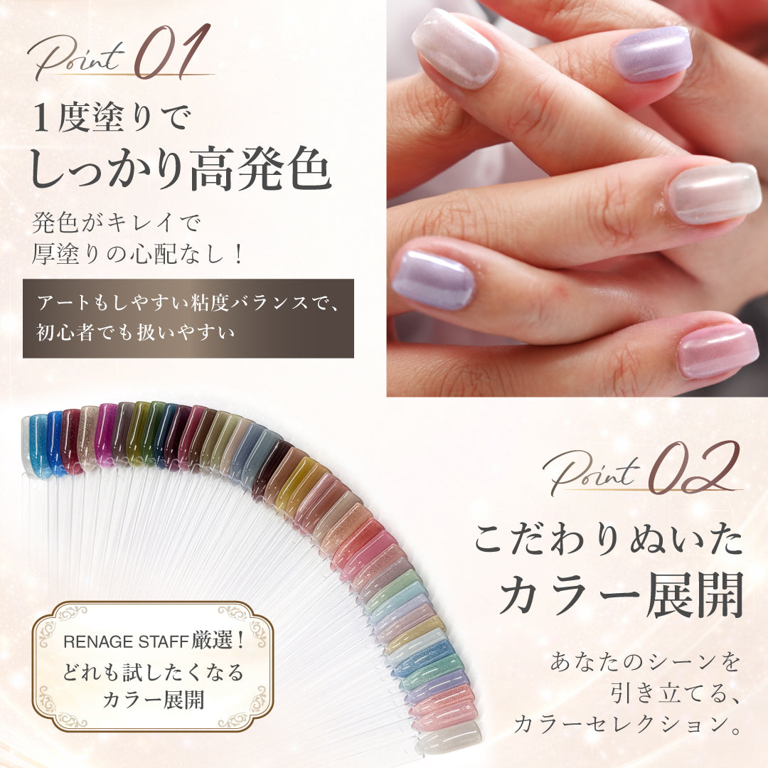 チャンネル登録者数13万人のネイリストYouTuber ASKAさん監修のもと、使い心地と高発色に徹底的にこだわって開発。HEMAフリー処方で、アレルギーが気になる方や肌が敏感な方にも配慮。毎日使うものだからこそ、品質・成分・使用感の細部にまで妥協しないジェルネイルです!